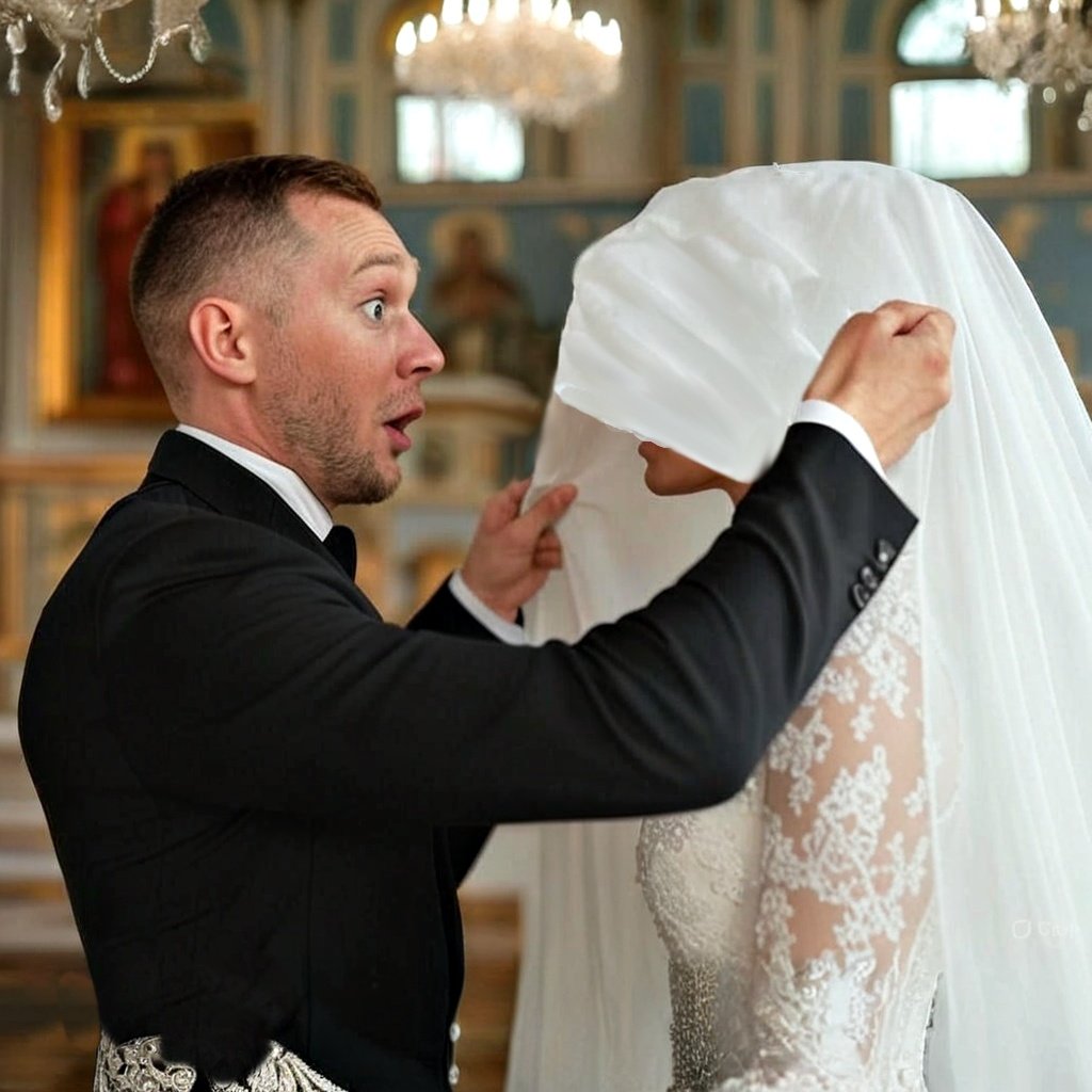 Должно быть, невеста тоже нервничала. Евгений с трепетом взялся за края вуали. Он медленно поднял её вверх, открывая лицо невесты.