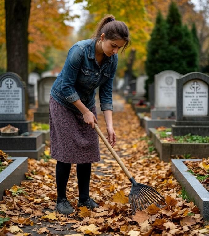Катя подошла к одной из свежих оградок. Там почти нечего было убирать — явно родные были здесь недавно. Только сухие цветы остались, их она аккуратно собирала.